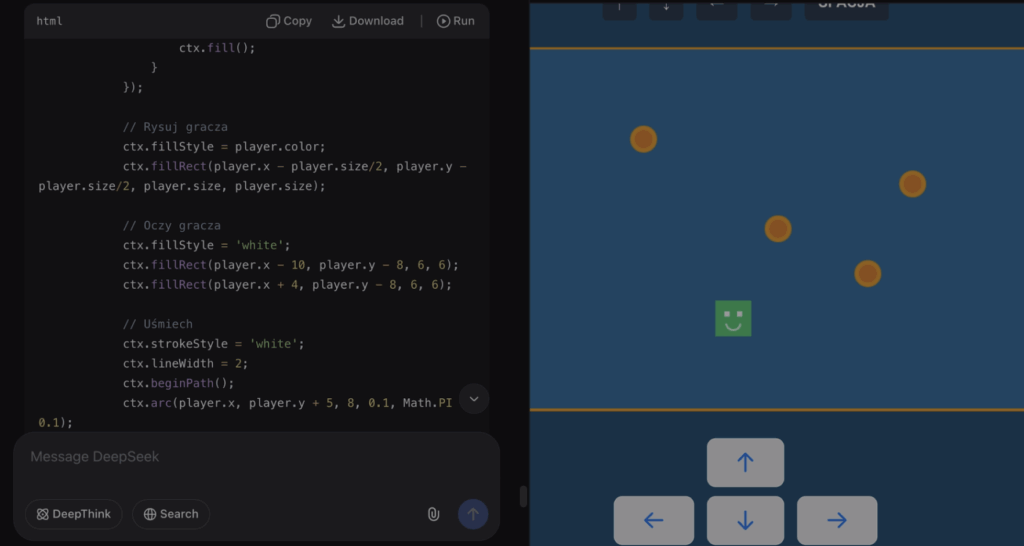 Uczniowie korzystają z czatu DeepSeek, by generować i ulepszać kod, a następnie tworzą gry w jednym z wybranych środowisk: Scratch, Python (Pygame lub tekstowy) albo HTML/CSS/JavaScript. Każda gra musi spełniać konkretne wymagania — być grywalna w mniej niż 5 minut, mieć czytelny cel i warunki wygranej lub przegranej, duże, proste w odbiorze grafiki oraz intuicyjne sterowanie (klawisze strzałek, spacja lub mysz).
