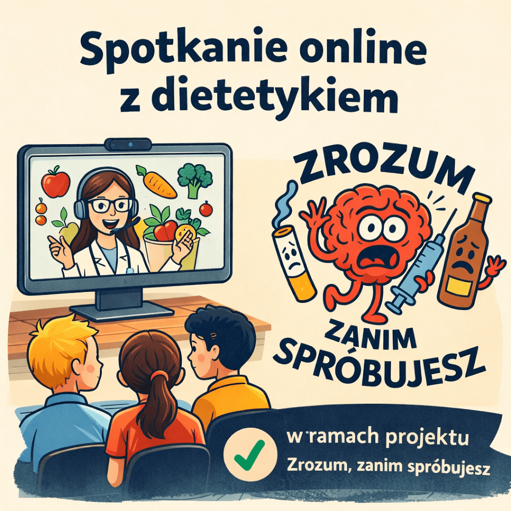 Dzisiejszy dzień upłynął w naszej szkole pod znakiem ważnej i bardzo potrzebnej rozmowy o zdrowiu. W ramach projektu społecznego „Zrozum, zanim spróbujesz” odbyło się spotkanie online z dietetykiem, w którym uczestniczyli nasi uczniowie.